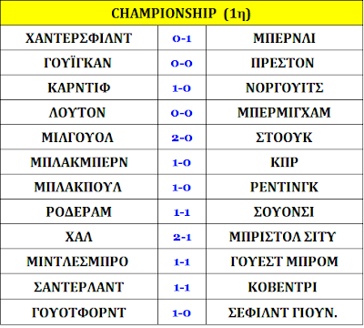 Στα αποτελέσματα της πρεμιέρας , η Μίλγουολ (2-0 την Στόουκ) και η Χαλ (2-1 την Μπρίστολ Σίτυ) ξεκίνησαν με το ''δεξί'' ....κάτι που δεν κατάφερε η Νόριτς του Δημήτρη Γιαννούλη (ξεκίνησε βασικός) που ηττήθηκε με σκορ 1-0 στο Κάρντιφ!