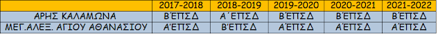 * Την περίοδο 2020-21 δεν αγωνίστηκαν στην συγκεκριμένη έδρα αφού το πρωτάθλημα διακόπηκε λόγω πανδημίας...την περίοδο 2021-22 δεν ήταν στον ίδιο όμιλο πρωταθλήματος και μπαράζ....