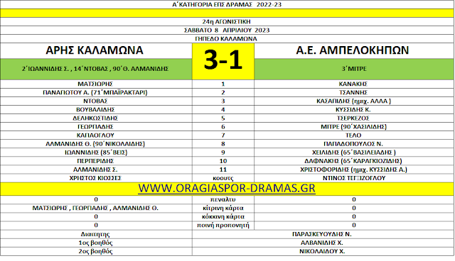 Συνέχισε την εντυπωσιακή πορεία των τελευταίων αγωνιστικών ο Άρης Καλαμώνας που διεύρυνε το αήττητο σερί του σε τέσσερις αγώνες (τρείς νίκες και μια ισοπαλία) νικώντας με σκορ 3-1 την Α.Ε. Αμπελοκήπων , στο πλαίσιο της 24ης αγωνιστικής του πρωταθλήματος της Α΄ΕΠΣ Δράμας !