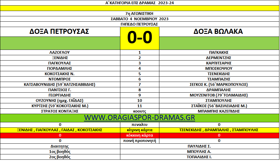 (Χ)ωρίς νικητή ολοκληρώθηκε η αναμέτρηση ανάμεσα στην Δόξα Πετρούσας και την Δόξα Βώλακα που έμειναν στο ''μηδέν'' (0-0) , στο πλαίσιο της 7ης αγωνιστικής του πρωταθλήματος της Α΄ΕΠΣ Δράμας .